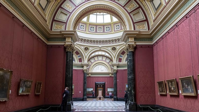 7月4日,參觀者佩戴口罩在英國國家美術(shù)館的媒體開放日上參觀。參觀者需提前網(wǎng)上預(yù)約參觀時段,全程佩戴口罩且保持安全距離。