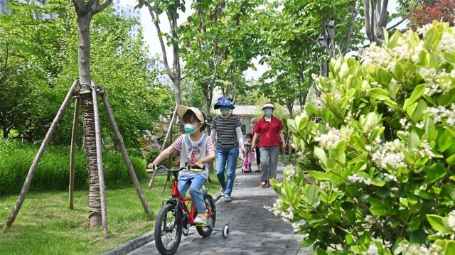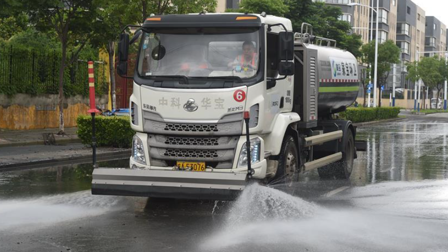 6月15日,在合肥市廬陽(yáng)經(jīng)濟(jì)開發(fā)區(qū),工作人員駕駛灑水車清潔路面。