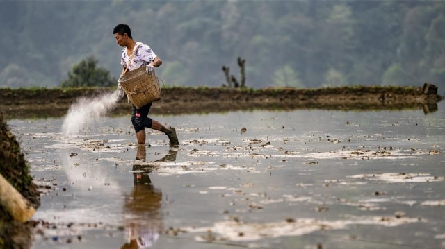 5月17日,在吉林省長春市雙陽區(qū)徐家村,農(nóng)民在水稻田間耕作。