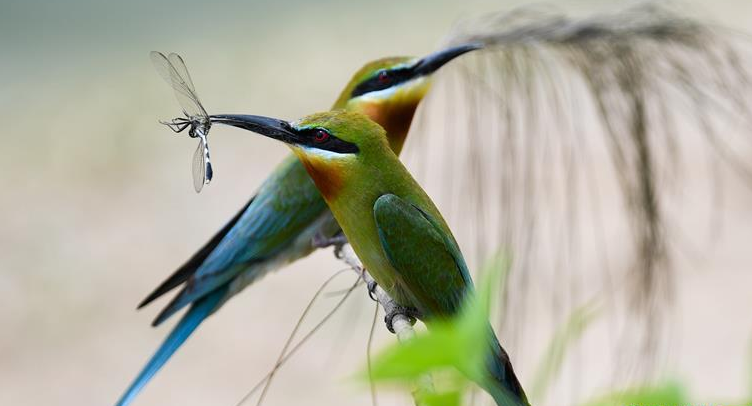 近日,不少栗喉蜂虎來到海南省海口市筑巢繁殖,據(jù)海口畓榃濕地研究所工作人員統(tǒng)計(jì),目前來到??诘睦鹾矸浠⒁延薪?00只。