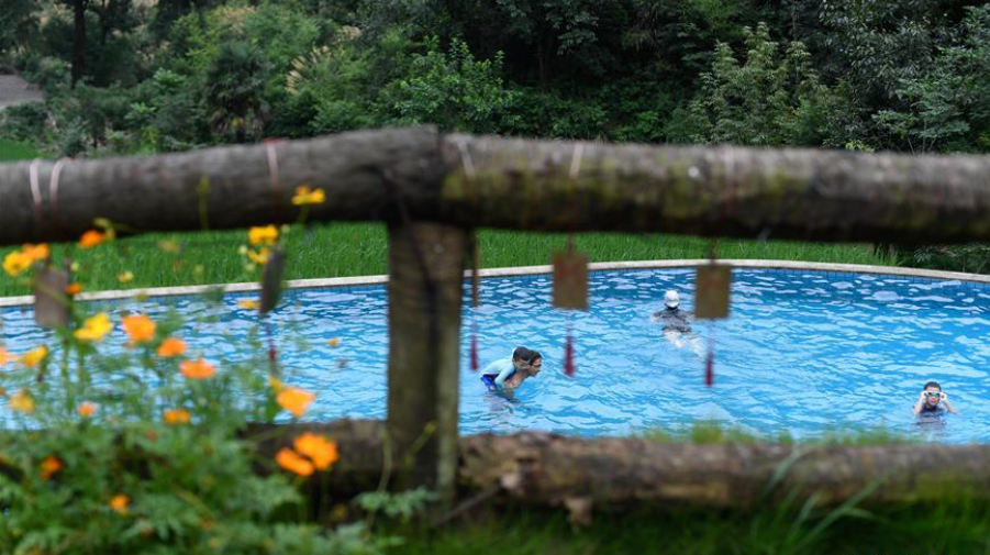 7月18日,游客在戴家山村一家民宿游泳。