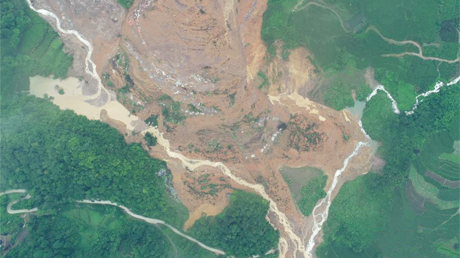 7月17日,一名地質勘查人員在湖南省石門縣南北鎮(zhèn)潘坪村雷家山滑坡現(xiàn)場查看災情。