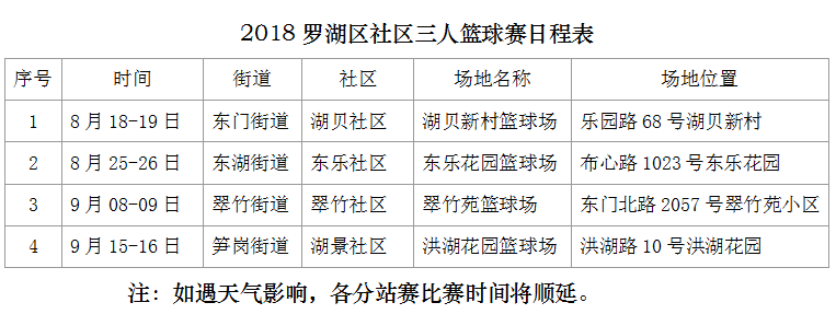 “2018羅湖區(qū)社區(qū)三人籃球賽”分成四個(gè)分站賽。目前,羅湖區(qū)東門街道湖貝社區(qū)的“東門站”首場(chǎng)分站賽已決出勝負(fù),接下來(lái)的三個(gè)分站賽地點(diǎn)分別是羅湖區(qū)東湖街道東樂(lè)社區(qū)、羅湖區(qū)翠竹街道翠竹社區(qū)和羅湖區(qū)筍崗街道湖景社區(qū)。
