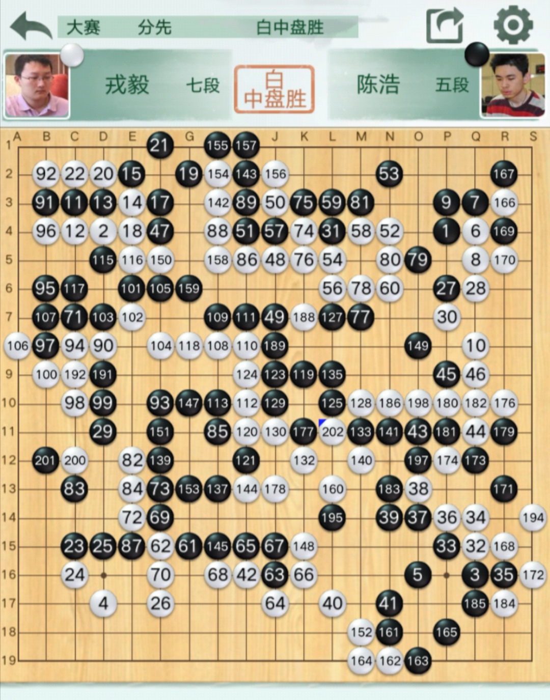 戎毅率先贏了陳浩五段(對陣棋譜)