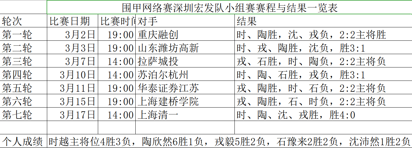 附1:《圍甲網(wǎng)絡(luò)賽深圳宏發(fā)隊(duì)小組賽賽程與結(jié)果一覽表》