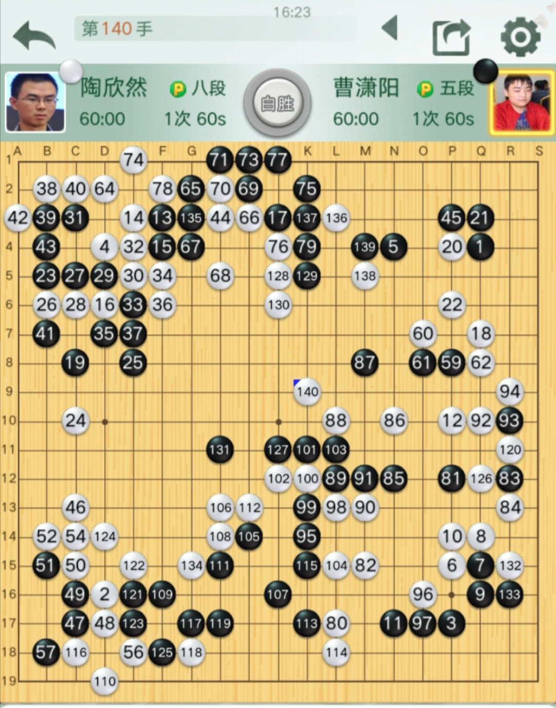 陶欣然自評(píng):布局階段至44的轉(zhuǎn)換差不多。黑63動(dòng)出至79收獲不大,白方確立優(yōu)勢(shì)。白116吃住左下角后領(lǐng)先不少了。