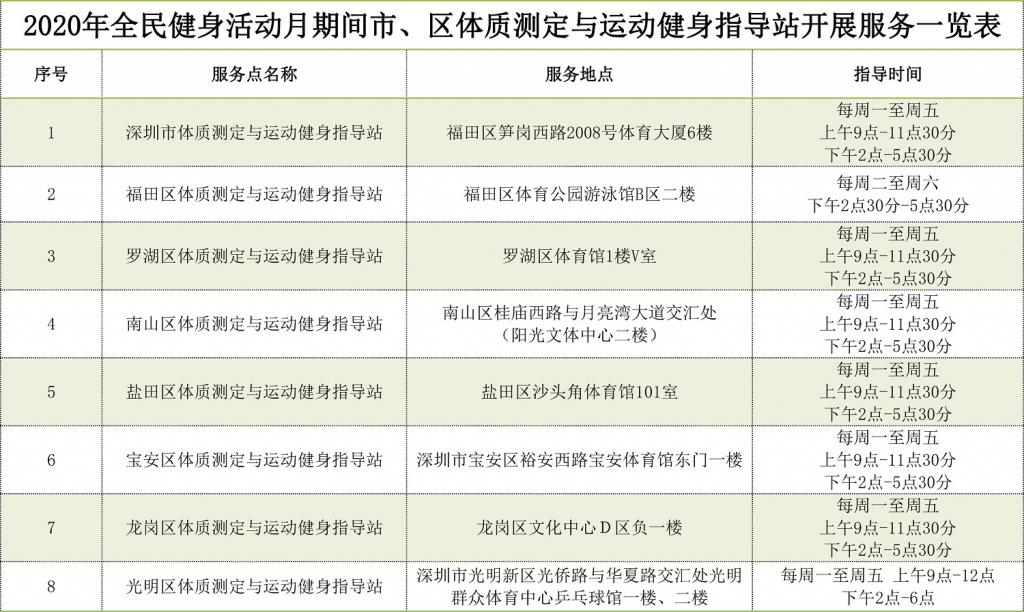 2020年深圳全民健身活動(dòng)月期間體質(zhì)測定服務(wù)表: