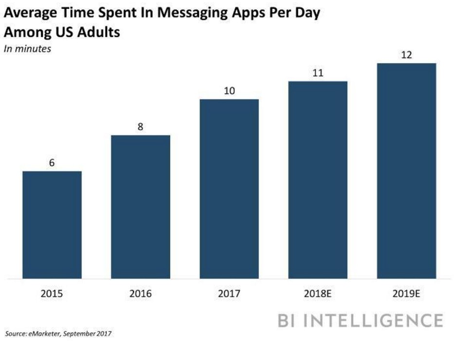 據(jù)市場(chǎng)研究公司eMarketer的統(tǒng)計(jì)數(shù)據(jù)顯示,去年,美國(guó)消費(fèi)者平均每天在一款通訊應(yīng)用上逗留的時(shí)間是10分鐘,較2016年的8分鐘增長(zhǎng)了15.2%。這個(gè)平均逗留時(shí)間在今年有望增長(zhǎng)到11分鐘,在2019年有望增長(zhǎng)到12分鐘。