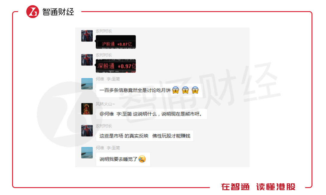 被黑天鵝痛擊一番后,市場悲觀情緒明顯占據(jù)了上風(fēng)。智通財(cái)經(jīng)APP觀察到,某500人的投資大群雖活躍度照常,但全變成了說“新財(cái)富風(fēng)月”、“品月餅”,絲毫沒有往日的“談市場、擺數(shù)據(jù)、說動(dòng)向”,甚至不惜爭個(gè)臉紅耳赤的情形。