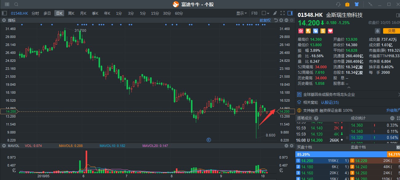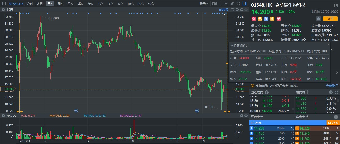 談及去年的港股牛市,金斯瑞應該算得上是生物醫(yī)藥板塊中,非常引人注目的一只股票。就算2018年隨大市回調,但表現(xiàn)仍可圈可點:受益港股通北水資金利好,成交量異常活躍,成交量平均每日達到2000萬股,總額平均4.08億港元。細數(shù)港股通標的,有如此活躍成交量的股票確實不多。