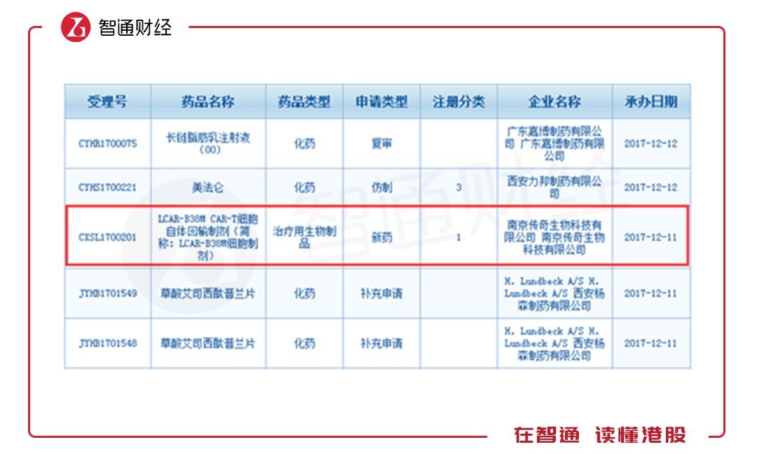 到2017年12月11日,傳奇生物提交CAR-T療法中國臨床申請(CXSL1700201)獲得CDE正式承辦受理,成為國內(nèi)首個獲得受理的CAR-T產(chǎn)品。同月18日,藥品評審中心公布第二十五批優(yōu)先審評審批名單,傳奇生物的LCAR-B38MCAR-T細胞自體回輸制劑獲準進入。2018年3月12日獲CFDA臨床審批完畢。