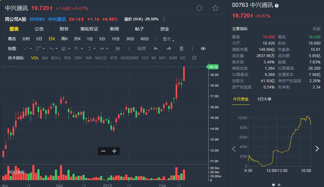 截至發(fā)稿,中興通訊(00763)漲9.07%,報(bào)19.720港元。(劉大洋)