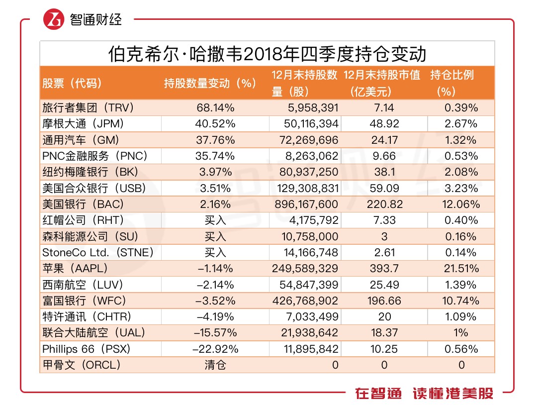 截至12月末,伯克希爾的十大重倉股分別為蘋果、美國銀行、富國銀行、可口可樂、美國運通、卡夫亨氏、美國合眾銀行、摩根大通、紐約梅隆銀行及穆迪。