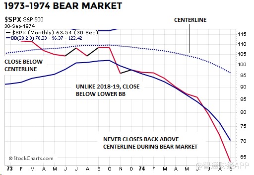 下圖是1973-74年時(shí)的情形,標(biāo)普500指數(shù)在整個(gè)熊市期間都無法重新回到布林通道中軌之上。與2019年(即到目前為止)不同的是,1973年11月標(biāo)普500指數(shù)收于下軌以下: