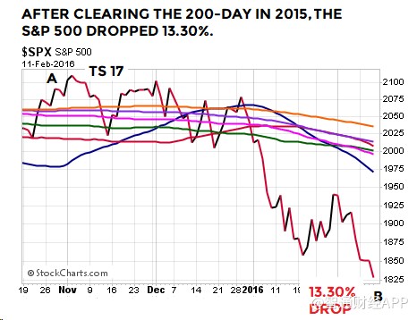 收高于200日均線并非安全信號。2015年,標(biāo)普500指數(shù)連續(xù)8個(gè)交易日收于200日上方,但隨后下跌了13.30%: