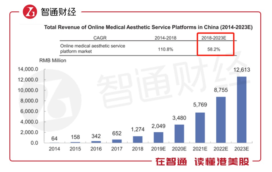 因此,近年來的線上醫(yī)美平臺(tái)憑借自身的優(yōu)勢(shì)快速崛起。從2018-2023年,線上醫(yī)美市場預(yù)計(jì)的年復(fù)合增長率為58.2%,遠(yuǎn)快于整體醫(yī)美市場的增長速度。