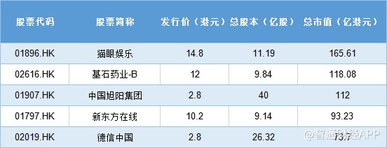 據(jù)智通財(cái)經(jīng)APP統(tǒng)計(jì),按上市時(shí)的總股本計(jì)算,一季度的新股整體體量較小,普遍總市值在50億港元以下,僅三只新股總市值超過百億,分別為貓眼娛樂、基石藥業(yè)-B、中國旭陽集團(tuán)。其中,貓眼娛樂以165.61億港元的總市值,成為一季度的最重磅股。