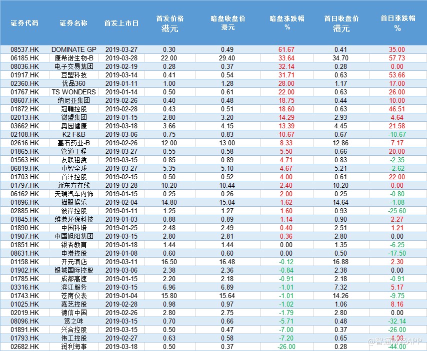 另外,截至一季度底,36只新股中,共有14只股失守發(fā)行價(jià),破發(fā)率為39%。值得的注意的是,相比于2018年港股新股70%的破發(fā)率,2019年一季度的破發(fā)率有明顯的下降。其中,天瑞汽車內(nèi)飾以42.36%,成為一季度市場表現(xiàn)最差新股。而嘉藝控股則以196.23%的漲幅,成為一季度市場表現(xiàn)最牛新股。(陳嘉林)