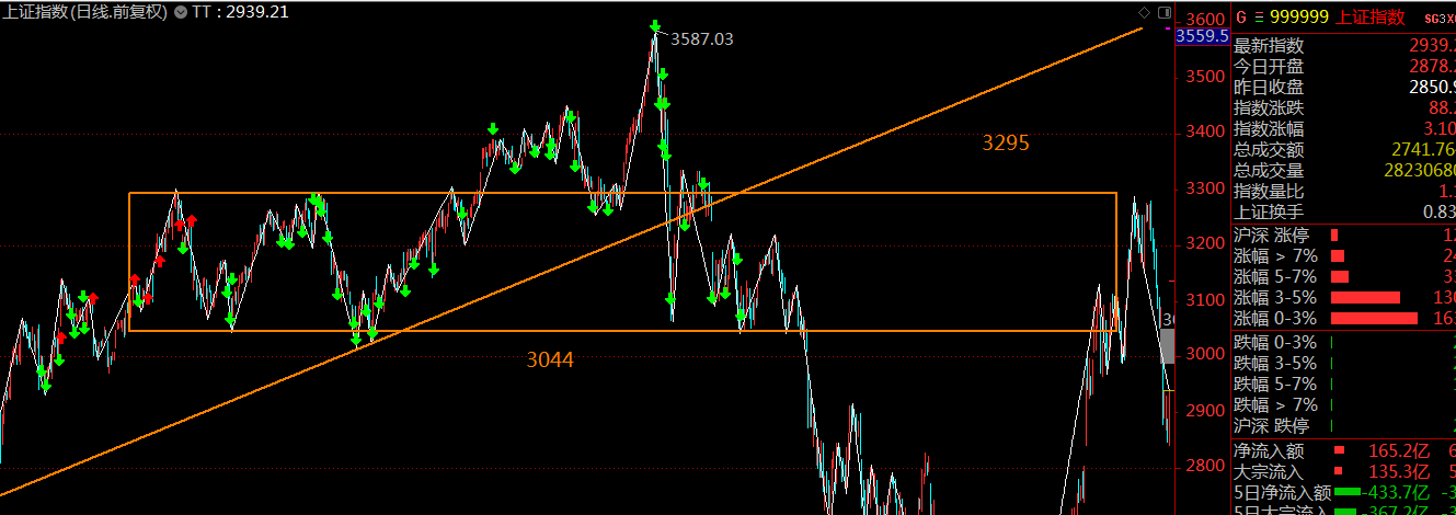 再看5分鐘級別走勢結(jié)構(gòu),在特朗普的幫助下,這里直接跌穿了三月份構(gòu)建的三十分鐘級別中樞,力度較大。周五逆轉(zhuǎn)趨勢后,在三十分鐘中樞下面,完成了這段下跌趨勢第二個五分鐘中樞的構(gòu)建工作。大概率宣告了這段五分鐘下跌趨勢的終結(jié)。下周一、周二,上證指數(shù)面臨了上方30分鐘中樞下軌2968點(diǎn)的反壓,可能會出現(xiàn)回落,投資者可逢低吸納。