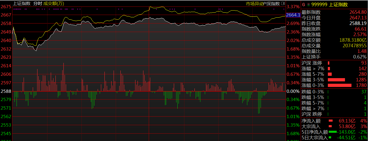 截至早盤收盤,上證指數報2643點,漲1.60%;深證成指報7844點,漲1.90%;創(chuàng)業(yè)板指數報1356點,漲1.35%。盤面上,板塊全面上漲,高鐵、水泥、家電、機場航運等板塊逆勢上漲。