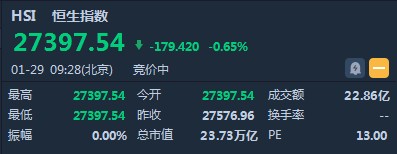 恒生指數(shù)開(kāi)盤(pán)跌179.42點(diǎn)或0.65%,報(bào)27397.54點(diǎn)。國(guó)企指數(shù)跌0.45%,報(bào)10833.6點(diǎn)。紅籌指數(shù)跌0.79%,報(bào)4304.49點(diǎn)。大市盤(pán)前成交22.86億港元。