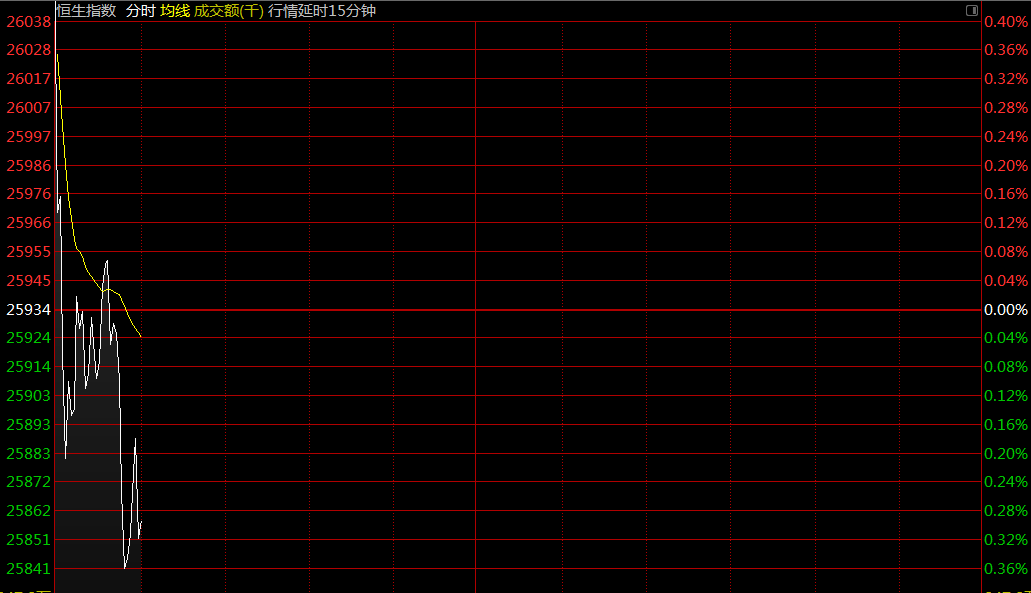 恒生指數(shù)開盤跌1.15%,報(bào)25925.09點(diǎn)。國企指數(shù)跌1.2%,報(bào)10575.62點(diǎn)。紅籌指數(shù)跌0.75%,報(bào)4255.89點(diǎn)。大市盤前成交17.25億港元。