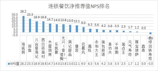 數(shù)據(jù)表明,此次調(diào)研餐飲品品牌整體的平均凈推薦值為9.4分。排名第一的是海底撈,凈推薦值為28.2分;其次是探魚,凈推薦值為23.3分;第三名是八合里海記,凈推薦值為18.9分。前十名品牌依次為,海底撈、探魚、八合里海記、西貝莜面村、木屋燒烤、樂凱撒、太興(香港)餐廳、滿記甜品、唐宮、巴蜀風。禾綠回轉壽司在此次調(diào)研中凈推薦值僅為-3.0分,在凈推薦值排名中墊底。