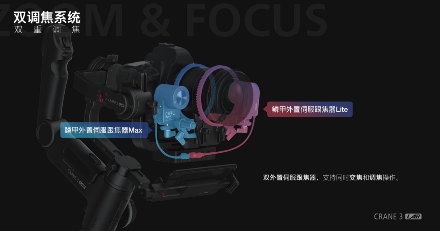云鶴3 LAB可搭載雙外置伺服跟焦器,支持變焦和跟焦同時(shí)操作。傳統(tǒng)電子跟焦精度低,延遲高,只能兼容特定品牌的相機(jī)加鏡頭,調(diào)焦不順滑;外置伺服跟焦高精度,無延遲,對相機(jī)和鏡頭無特殊要求,調(diào)焦順滑。雙外置伺服跟焦高精度,無延遲,對相機(jī)和鏡頭無特殊要求,跟焦、變焦順滑,支持同時(shí)操作。既可以通過機(jī)器上的跟焦手輪和船型按鍵控制調(diào)焦和變焦,也可以通過ViaTouch在手機(jī)屏幕上直接控制調(diào)焦和變焦。
