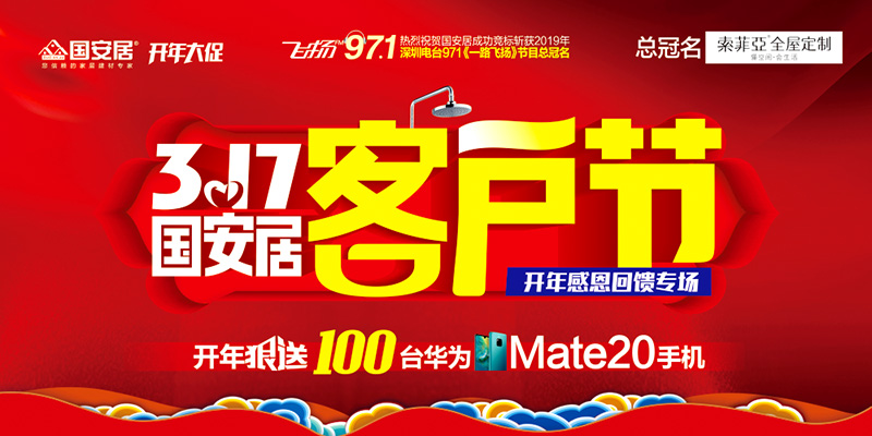 國安居一直心懷感恩,感謝十多年來累計(jì)30萬老客戶的信賴與支持,此次活動不僅是為了品牌優(yōu)惠,更多的是給老客戶送去關(guān)懷和福利。國安居特聯(lián)合深圳電臺971王牌節(jié)目一路飛揚(yáng)鼎力巨獻(xiàn),聯(lián)手旗下百位工廠總裁打造開年大促,推出多重優(yōu)惠:1、開年狠送100臺華為mate20手機(jī);2、聯(lián)購滿額返100萬現(xiàn)金,上不封頂?shù)瘸祷仞伝顒?,?.15為契機(jī)來回饋多年來關(guān)注國安居、支持國安居的廣大消費(fèi)者,以最大限度的優(yōu)惠、最為超值的實(shí)惠、最為驚喜的鉅惠獻(xiàn)禮3.17大促!