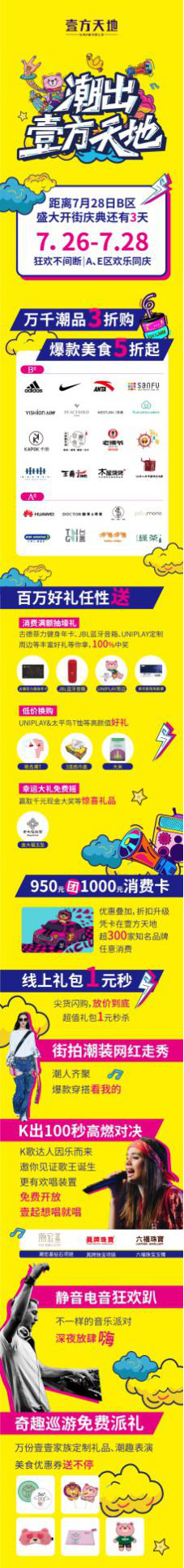 開業(yè)期間,精彩紛呈的活動當(dāng)然是必不可少的。7.26-7.28開業(yè)期間,B區(qū)將聯(lián)動A區(qū)、E區(qū)開展一系列活動。開業(yè)活動緊扣B區(qū)定位“潮流品味先鋒主場”,充分抓住當(dāng)下年輕人愛玩、敢玩的特色,將整個壹方天地變?yōu)槌比ぁ㈧趴岬臍g樂海洋。