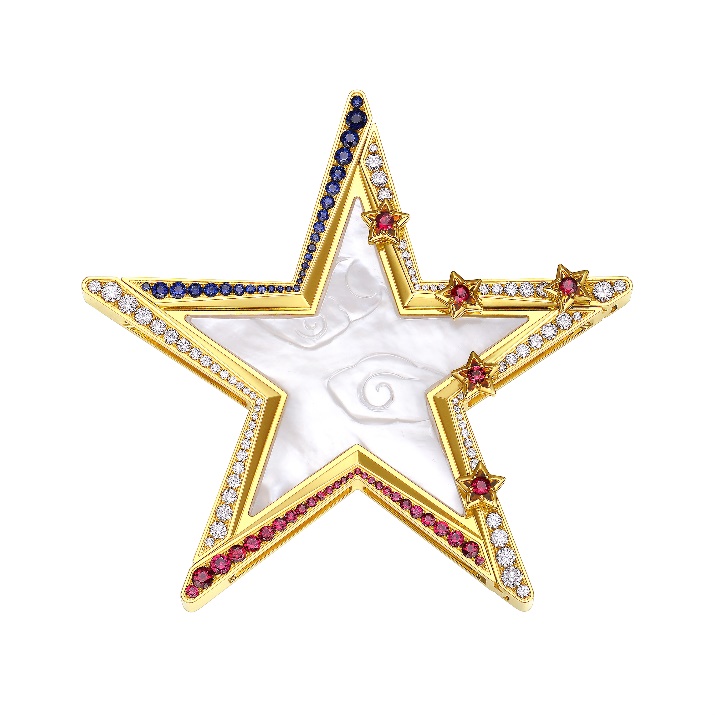 作為本次發(fā)布會(huì)主角,周大福17916系列新品“宸”曾作為第11屆“法國(guó)圣埃蒂安國(guó)際設(shè)計(jì)雙年展”參展作品,在世界舞臺(tái)上綻放過(guò)光芒?!拔褰切恰钡脑煨腿谌肓朔▏?guó)國(guó)旗藍(lán)、白、紅三色和中國(guó)國(guó)旗的五角星元素,代表了中法兩國(guó)的交流與合作,雙方希望通過(guò)宸這樣意義深遠(yuǎn)的產(chǎn)品,見(jiàn)證和促進(jìn)兩國(guó)的和平發(fā)展與經(jīng)濟(jì)交流?!板贰币员睒O星為靈感來(lái)源,寓意點(diǎn)亮年輕人的生活與夢(mèng)想。別具一格的五角星設(shè)計(jì)藝術(shù)感十足,鉆石與22K金的加持,更讓整個(gè)作品展現(xiàn)出奪目光彩。白貝母項(xiàng)鏈外圈圍以鉆石、寶石,一款三戴,幻化無(wú)限魅力。簡(jiǎn)潔的五角星造型,干凈有力,猶如夜空中指引前行的明星。