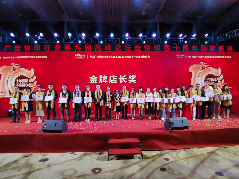 2019年,也是快印客成立的第十年,作為廣告快印行業(yè)新模式的創(chuàng)造者和領(lǐng)航者,本屆高峰會(huì)“十年見證,不忘初心”為主題,向行業(yè)展示了快印客十年取得的豐碩成果,共同開啟下一個(gè)黃金十年,并向過去一年里為行業(yè)做出突出貢獻(xiàn)的公司和個(gè)人頒發(fā)了榮譽(yù)獎(jiǎng)項(xiàng)。