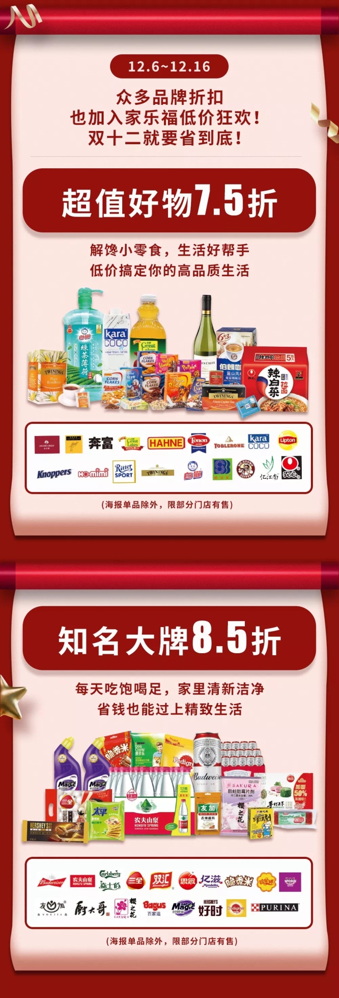 12月6日至16日,奔富、袋鼠、大湖、白貓、立頓、農(nóng)心、伯朗咖啡、憶江南等知名品牌商品,推出限時(shí)7.5折。百威、農(nóng)夫山泉、三全、雙匯、億滋、好時(shí)、偉嘉等大牌商品,奉上限時(shí)8.5折。寶潔系列產(chǎn)品,組合購(gòu)買,滿減更加優(yōu)惠;聯(lián)合利華系列產(chǎn)品,兩件折扣、勁爆組合價(jià)、買一送一歡樂購(gòu)。