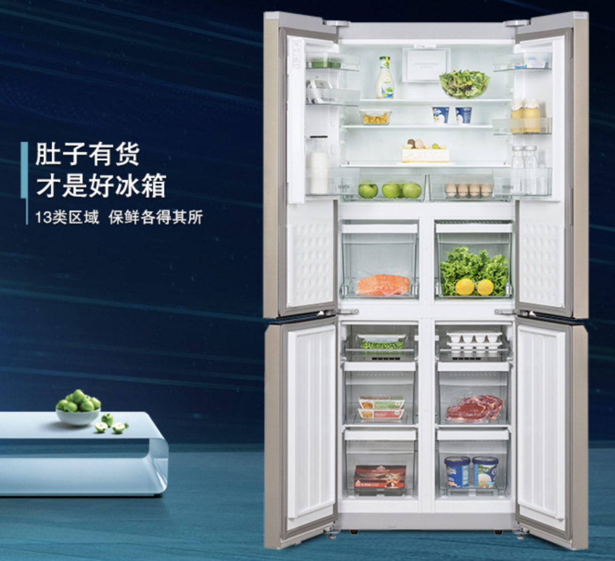 西門子KM46FA30TI采用十字對(duì)開門設(shè)計(jì),不僅簡(jiǎn)約美觀,容積更是達(dá)到了452升,13類區(qū)域設(shè)置,讓每份食物都各得其所,滿足了家庭更多的儲(chǔ)存需求?;炖潆p動(dòng)力、風(fēng)冷無(wú)霜、零度保鮮,可以讓蔬菜水果保持新鮮水嫩,也可以讓魚、肉營(yíng)養(yǎng)不流失,鮮嫩如常。LCD顯示+觸摸控制,嵌入式門把手,閉門系統(tǒng),它不妥協(xié)任何細(xì)節(jié),盡顯人們生活品味。