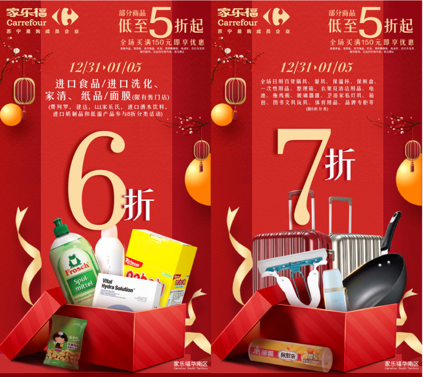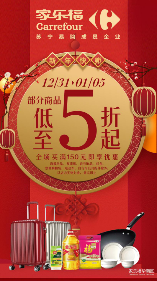 12月31日至1月5日,顧客于家樂福華南區(qū)門店全場(chǎng)買滿150元,即享指定產(chǎn)品5折起優(yōu)惠,省錢攻略一次解鎖。