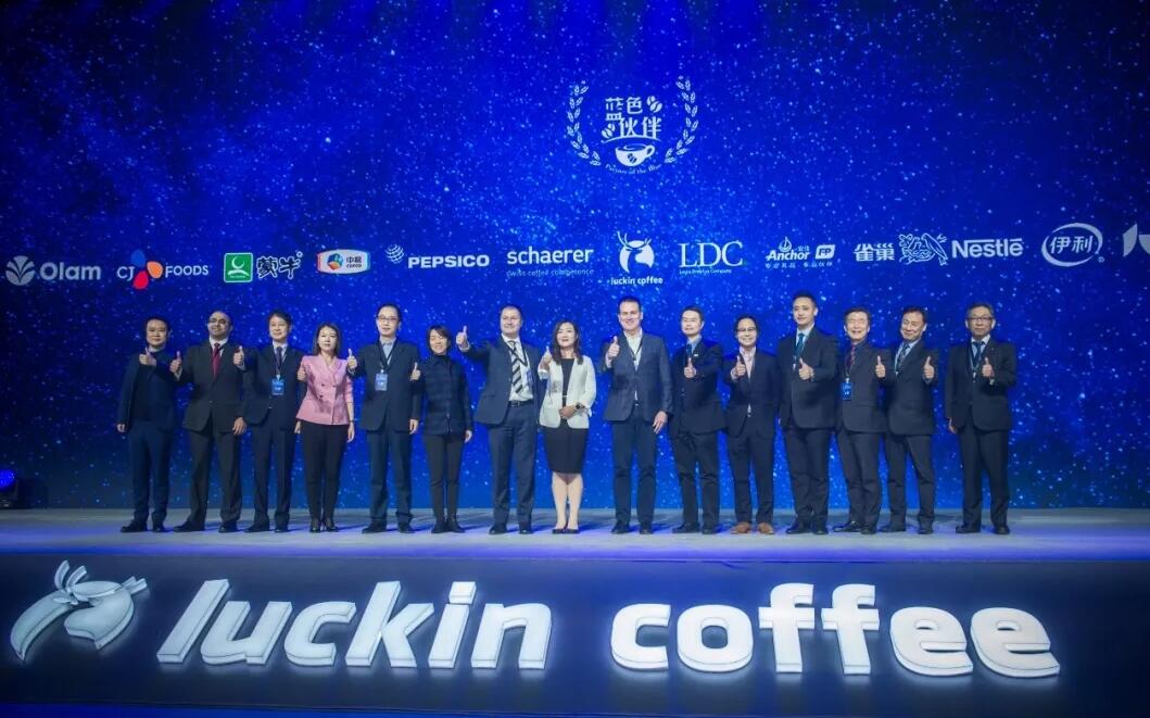 發(fā)布會現(xiàn)場,瑞幸咖啡與百事公司(PepsiCo)、雀巢(Nestle)、恒天然(Fonterra)、雪萊(Schaerer)、路易達孚(LDC)、奧蘭(Olam)、中糧、希杰(CJ)、伊利、蒙牛、好麗友、卡樂比等14家全球頂級供應(yīng)商共同啟動無人零售戰(zhàn)略發(fā)布儀式。