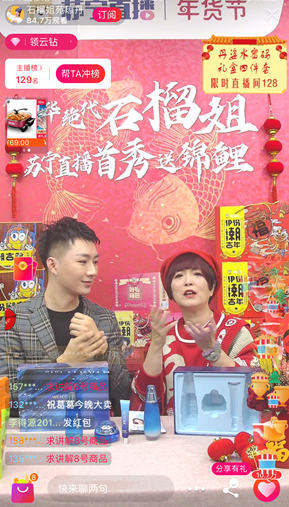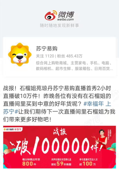 2020年伊始,“風(fēng)華絕代”的石榴姐苑瓊丹在蘇寧易購開始了新年帶貨直播首秀,為全網(wǎng)用戶推薦實(shí)用年貨,超過100萬人“圍觀”了直播,兩小時(shí)帶貨超10萬件,平均每分鐘售出800件年貨,其中最受消費(fèi)者歡迎的來伊份潮吉多堅(jiān)果禮盒59秒售罄,創(chuàng)下2020年明星帶貨的新記錄!