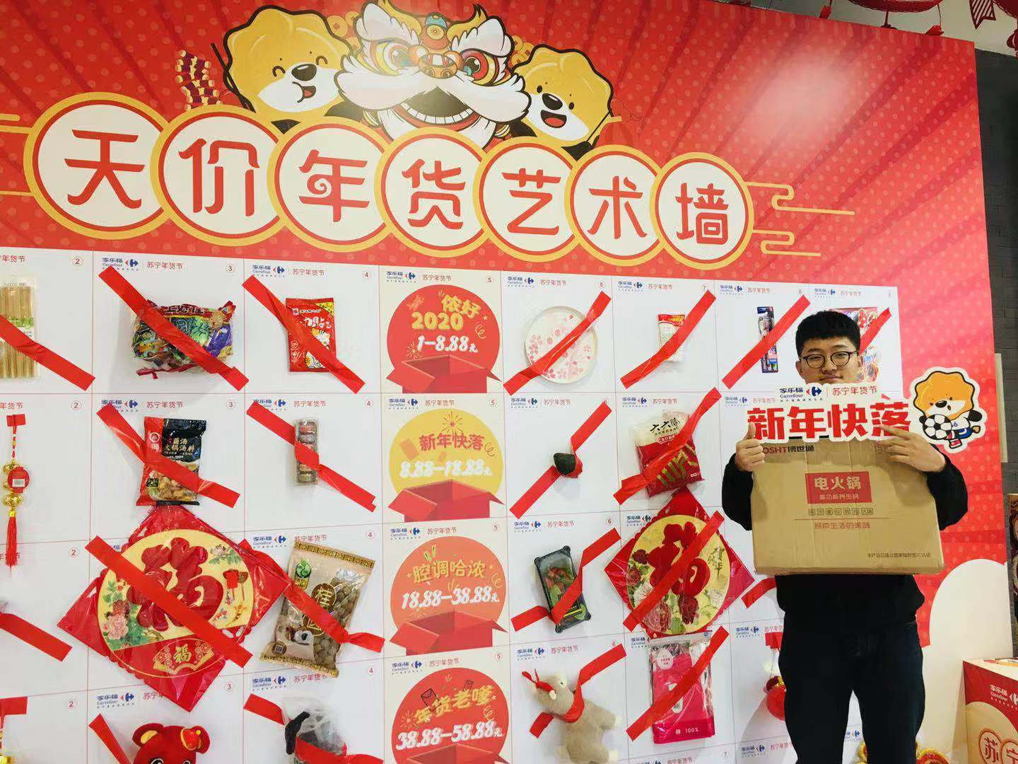 1月10日上午,記者來到家樂福“年味哈濃”天價年貨藝術墻的活動現(xiàn)場,眾多市民正想躍躍欲試。記者發(fā)現(xiàn),在天價年貨藝術墻上,有儂好2020、新年快落、腔調(diào)哈濃、年貨老嗲、“鼠”儂最美五類天價年貨。