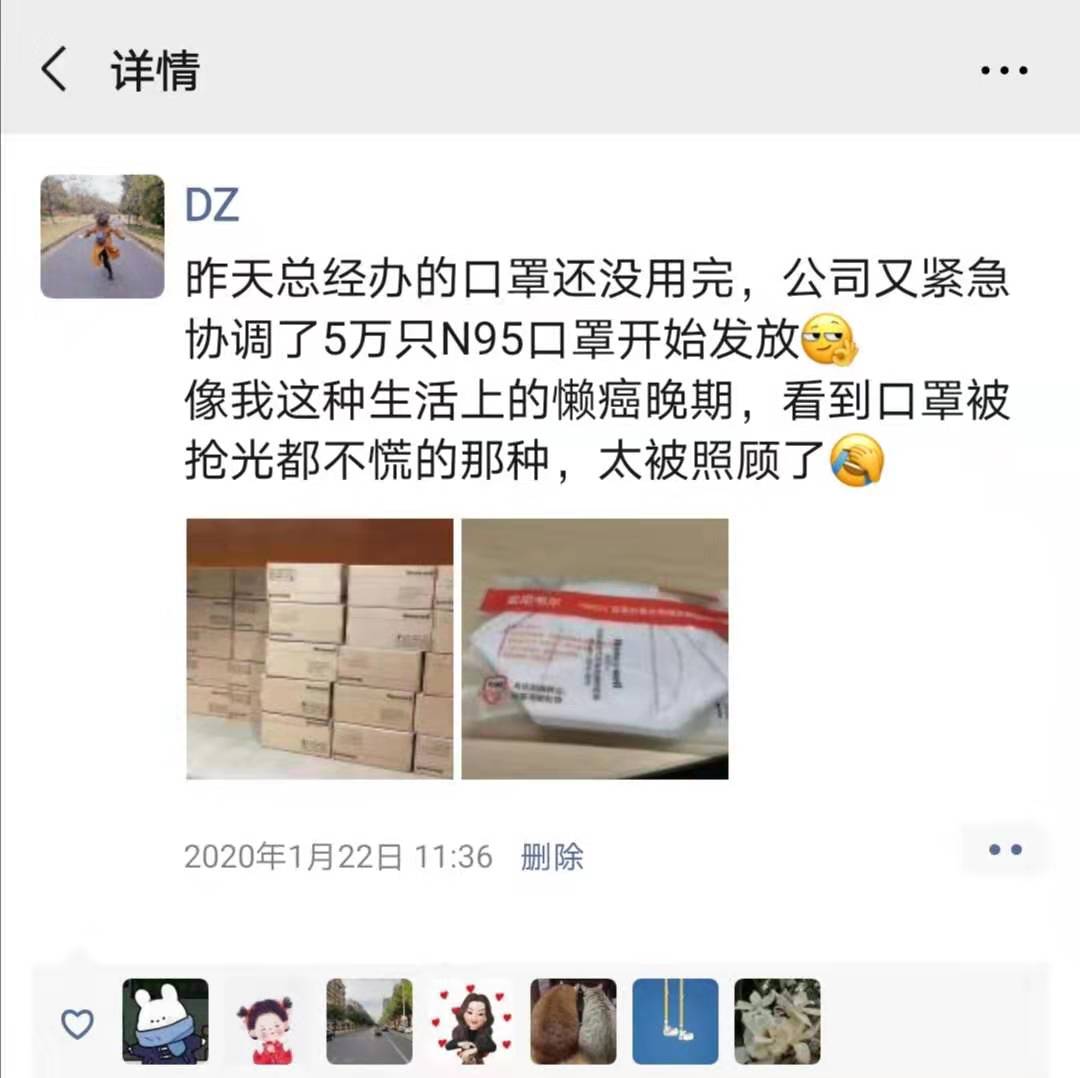 春節(jié)放假前夕,疫情形勢陡然嚴(yán)峻。在蘇寧南京總部工作的小丁清楚地記得,1月2 2 日那天,她在上班的路上,看到戴口罩的人多了起來,還和小伙伴念叨著也要趕緊買些。結(jié)果,當(dāng)天上午,部門就給每人發(fā)了一個全新的N9 5 口罩,讓她倍感驚喜和暖心。原來,蘇寧總部緊急調(diào)集了5萬個口罩發(fā)到員工手中,各大區(qū)也紛紛緊急調(diào)貨給員工發(fā)放。自稱“懶癌晚期”、平時連朋友圈都很少發(fā)的她,忍不住發(fā)圈為公司點(diǎn)贊。