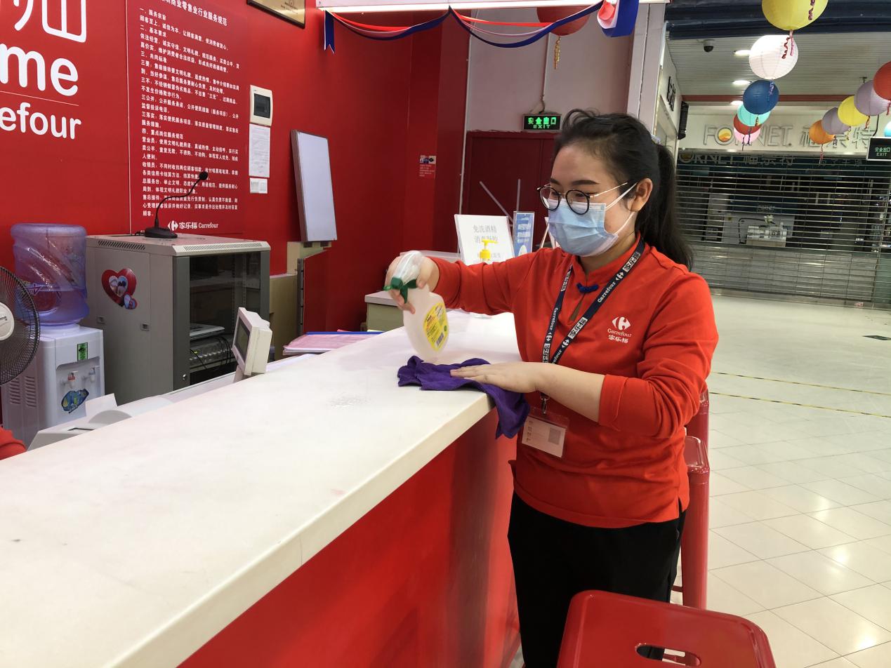 陳翠姣這次被分配到了超市收銀部門,由于是標準化操作,加上使用移動支付的顧客較多,技術(shù)難度不大,在資深員工的耐心指導下,她上手很快。陳翠姣表示對新崗位很滿意,她說,賦閑在家太久了,這次能換崗上任,很開心,“尤其是能夠加入到保障城市民生供應的大型商超,非常有意義。”下午3點,陳翠姣為服務中心柜臺做第三次消毒清潔后,便可以結(jié)束今日的早班工作,打卡下班了。