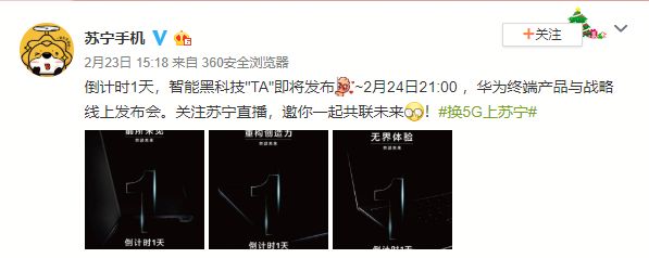 深圳新聞網(wǎng)2020年2月24日訊 2月24日21時(shí),華為新品“云發(fā)布會(huì)”將在蘇寧直播舉行,余承東等華為高層將亮相,為大家?guī)?lái)多款新品。從蘇寧手機(jī)官方微博發(fā)布內(nèi)容可以看到,此次華為新品發(fā)布會(huì)將推出全新的折疊屏手機(jī) Mate Xs以及新一代平板和筆記本電腦。