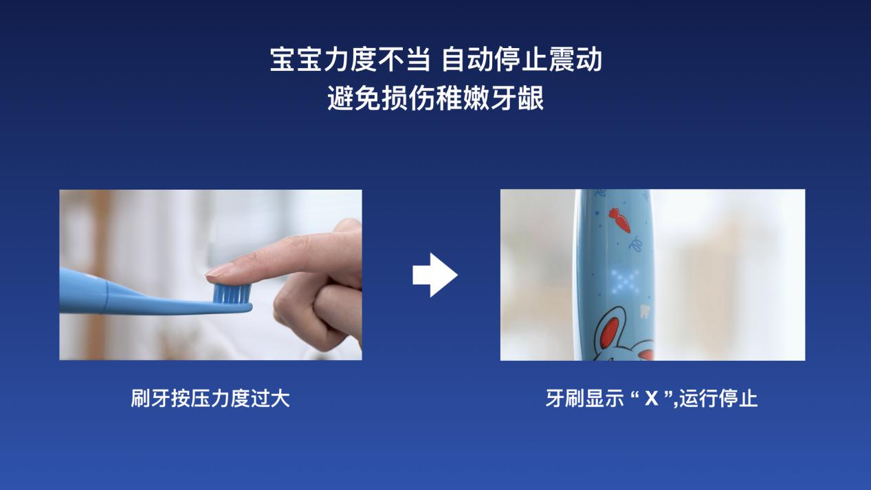 S7000K智能音樂兒童電動牙刷還支持自動過壓降頻保護,當(dāng)孩子在刷牙力度過大時,該功能就會啟動,自動停止振動,屏幕LED還會顯示出X型警告,保護孩子稚嫩的牙齦及牙釉質(zhì)。