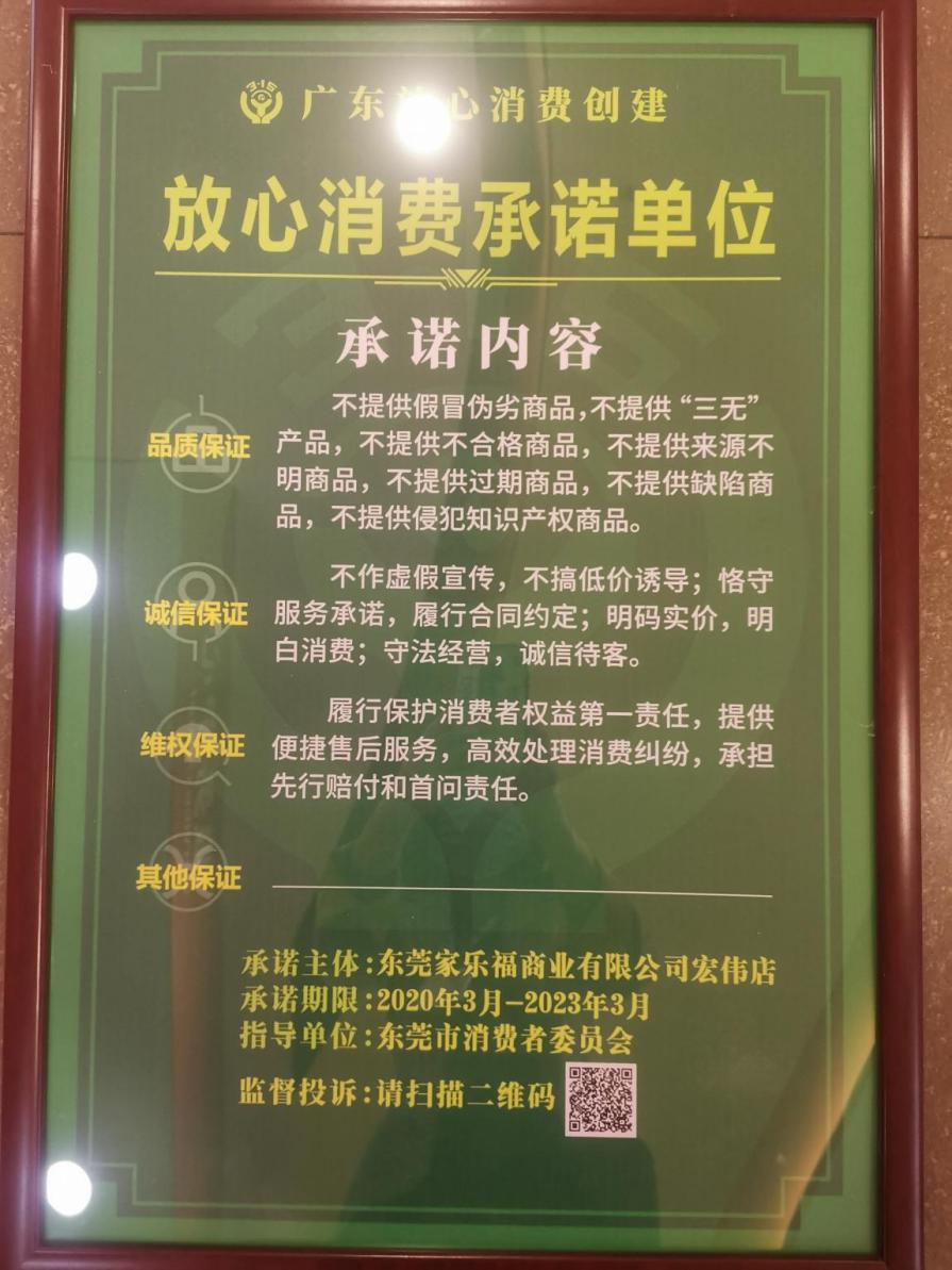 家樂福根據(jù)《經(jīng)營者“放心消費(fèi)承諾”活動規(guī)則(試行)》向社會公開作出品質(zhì)保證、誠信保證和維權(quán)保證的“三大承諾”,承諾不提供假冒偽劣商品,不提供“三無”產(chǎn)品;不作虛假宣傳;履行保護(hù)消費(fèi)者權(quán)益第一責(zé)任等,充分發(fā)揮放心消費(fèi)承諾單位示范作用,深入推進(jìn)放心消費(fèi)創(chuàng)建活動,深化消費(fèi)維權(quán)社會協(xié)同共治,營造安全放心的消費(fèi)環(huán)境。