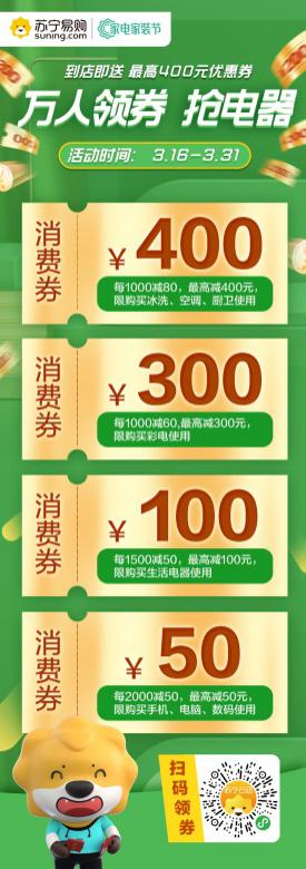 深圳蘇寧針對(duì)整個(gè)粵東區(qū)域投放近20萬(wàn)張消費(fèi)券,該券根據(jù)可用產(chǎn)品類型分為400元、300元、100元、50元四種不同面值。消費(fèi)券以電子券為形式發(fā)放,消費(fèi)者可通過(guò)深圳蘇寧微信公眾號(hào)、深圳蘇寧官方微博、蘇寧云店小程序和蘇寧易購(gòu)門店進(jìn)行領(lǐng)取,領(lǐng)取成功后,消費(fèi)券將自動(dòng)存儲(chǔ)在消費(fèi)者的蘇寧會(huì)員賬戶中,使用時(shí)系統(tǒng)會(huì)根據(jù)購(gòu)買的商品類別進(jìn)行自動(dòng)適配和抵扣結(jié)算。