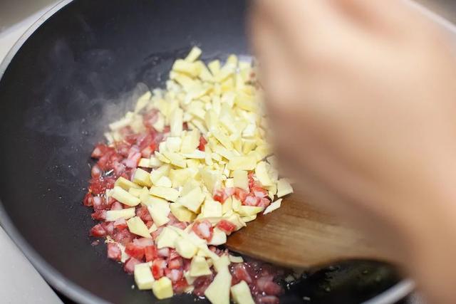 3.熱鍋下油,放入蒜頭爆香,然后倒入筍丁、臘腸丁、雪菜翻炒。