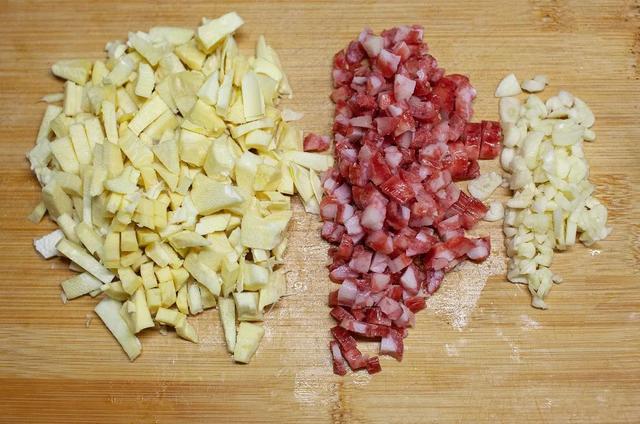 2.雪菜多洗幾遍,避免太咸;筍、臘腸、蒜頭切小?。还S丁焯一下水去除澀味。