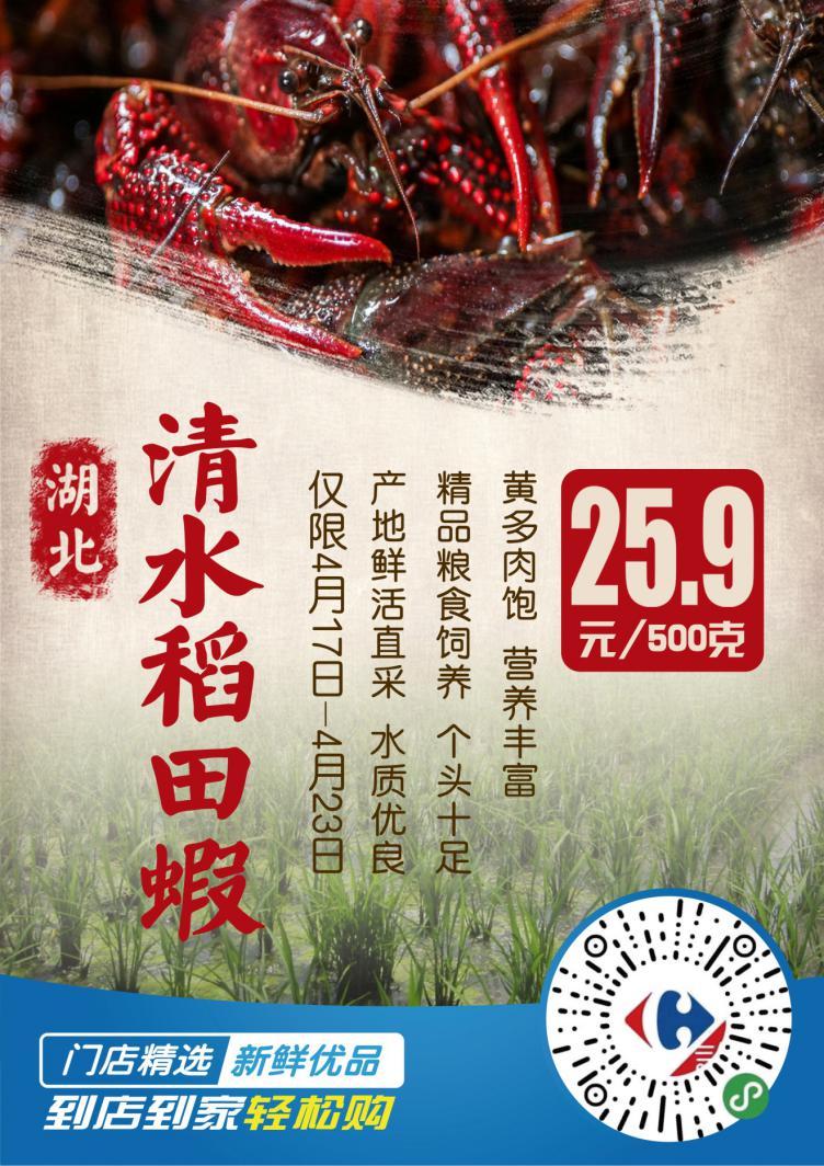 15號(hào)開(kāi)始捕撈的這批湖北“清水稻田蝦”將于16號(hào)完成分揀裝車,發(fā)往家樂(lè)福全國(guó)各地大倉(cāng),17號(hào),家樂(lè)福位于北京,上海、哈爾濱,長(zhǎng)沙,成都,昆明,廣州,深圳等地的155家門店鮮活開(kāi)售,恰逢家樂(lè)福418購(gòu)物節(jié),嘗鮮價(jià)低到25.9元/500克(僅限4月17日至23日)。同時(shí),顧客還可以通過(guò)家樂(lè)福小程序、蘇寧易購(gòu)app、蘇寧小店App、及美團(tuán)、餓了么下單,享受1小時(shí)送到家的極致“鮮“體驗(yàn)。
