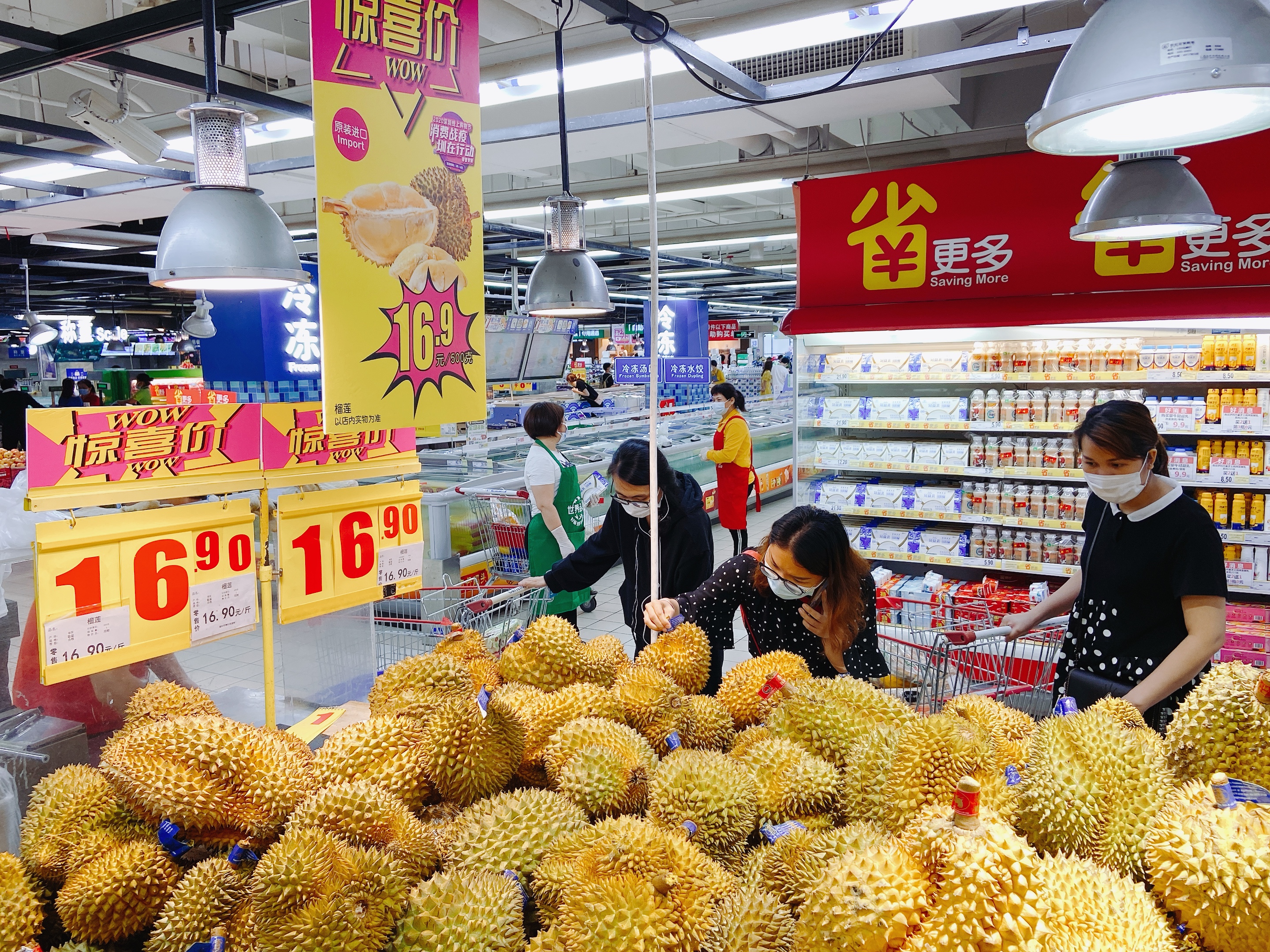 4月19日,記者來到家樂福一門店實地探訪。剛一步入生鮮區(qū)域,便被“泰國進(jìn)口榴蓮,白菜價16.9一斤”的促銷口號所吸引。整個生鮮區(qū)不乏各色接地氣的促銷口號,吆喝聲此起彼伏,吸引不少消費者駐足選購?!皠偵鲜械奶﹪鹫眍^,你看這個個頭、還有這個味道你聞聞,(每斤)只要16.9,比我們小區(qū)附近的生鮮超市還便宜”,一位受訪者對高性價比的泰國榴蓮贊不絕口。此次探店,記者聽到消費者最多的反饋是“品質(zhì)更好了,品種更多了”。家樂福深諳消費者的需求,想要促進(jìn)消費,首先要給消費者提供更多更好的選擇?!拔覀冞@次推出的’四月品鮮季’活動,有來自泰國、菲律賓等東南亞國家的反季水果,也有來自巴西、湖北的水產(chǎn)肉類。16.9元一斤的泰國金枕榴蓮、4.9元一斤的菲律賓切割蕉、25.9元一斤的湖北清水稻田蝦這幾天一直占據(jù)暢銷榜前三的位置”,該店負(fù)責(zé)人介紹。