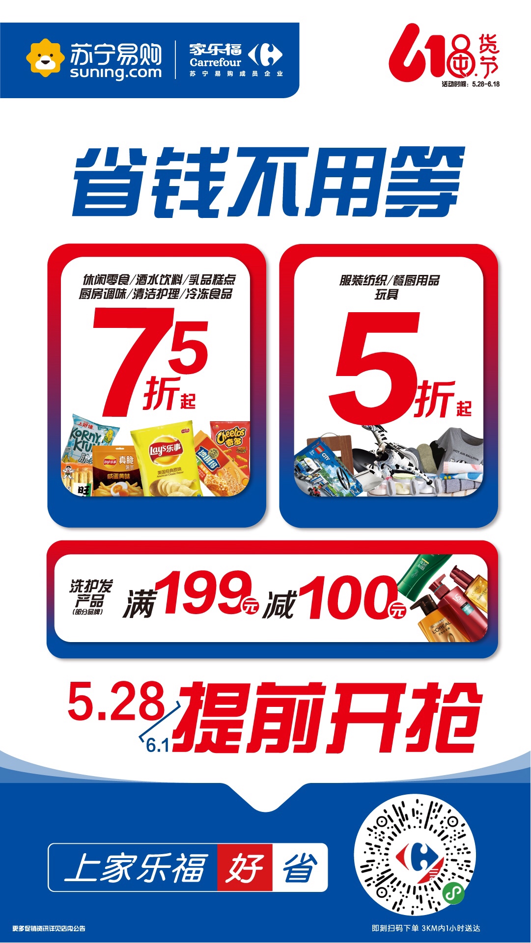 作為蘇寧陣營中的排頭兵、蘇寧大快消產(chǎn)業(yè)的核心部分,家樂福率先出戰(zhàn)。為了給消費(fèi)者提供充足時間選擇心儀的商品,家樂福618囤貨節(jié)即將拉開帷幕,讓消費(fèi)者盡享“618省錢不用等”的升級購物體驗。
