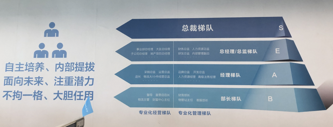 蘇寧主要通過1200校招工程進行人才梯隊培養(yǎng),將人才團隊劃分為B梯隊(部長梯隊)、A梯隊(經(jīng)理梯隊)、E梯隊(總經(jīng)理/總監(jiān)梯隊)、S梯隊(總裁梯隊),逐層選拔培養(yǎng),在潤物細無聲中形成了組織的人才梯隊。